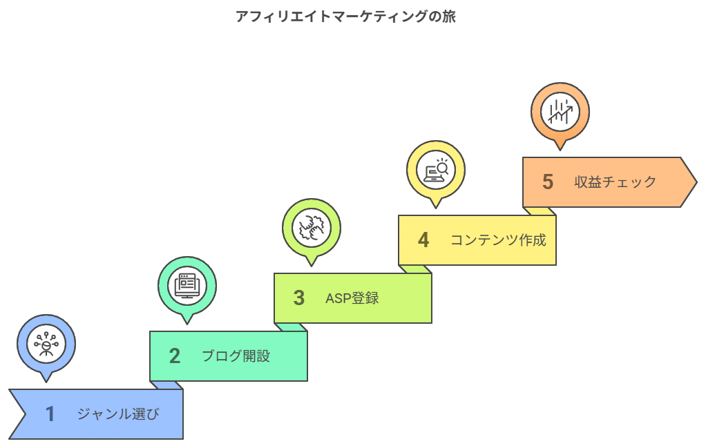 アフィリエイトを始めるには具体的にどんな手順が必要なのでしょうか。ここでは初心者が躓きやすいポイントも含めて、段階的に解説します。一歩ずつ確実に進めることで、効率的にアフィリエイトを軌道に乗せることができます。