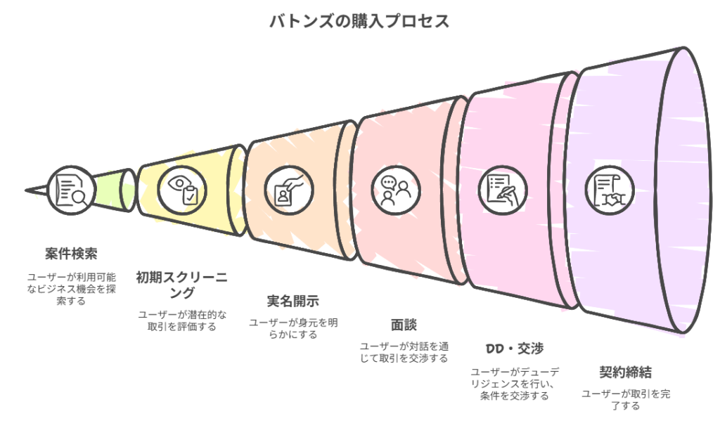 バトンズは2018年にサービスを開始したM&Aマッチングプラットフォームで、「誰でも、どこでも、簡単に、自由にM&Aができる社会の実現」をビジョンに掲げています。