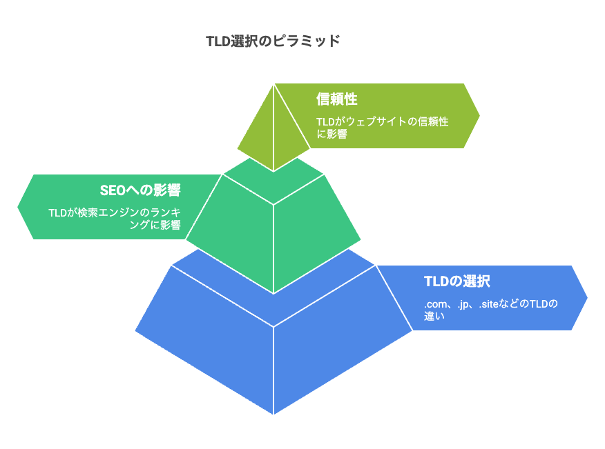 ドメインの最後に付く「.com」「.jp」などの部分、トップレベルドメイン(TLD)の選択もサイトの印象や信頼性に大きく影響します。