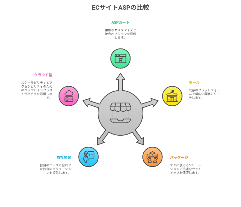ECサイト運営を検討する際、まず理解しておくべきなのがASPの基本的な仕組みと、他のECシステムとの違いです。ここでは、ASPの特徴と選択肢となる他のシステムについて詳しく解説します。