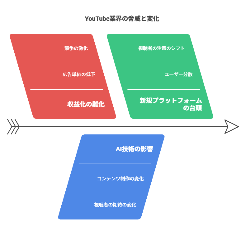 現在のユーチューバーを取り巻く環境変化は、単一の要因ではなく複数の脅威が同時進行しています。ここでは特に影響の大きい3つの脅威を詳しく分析し、それぞれがクリエイターに与える具体的な影響を解説します。