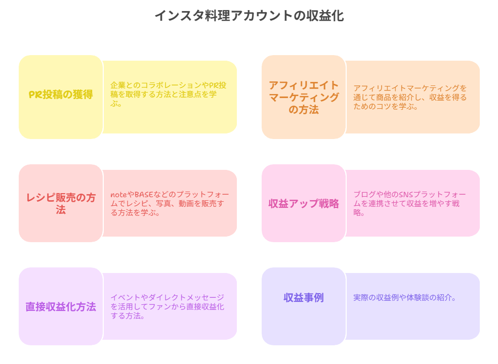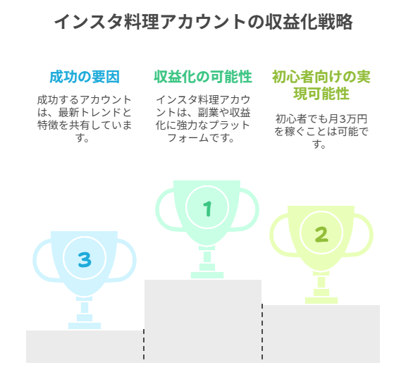 インスタの料理アカウントが収益化に適している理由から、実際の稼げる仕組み、成功事例まで、まずは全体像を把握しましょう。初心者が月3万円を目指すための現実的な戦略をお伝えします。