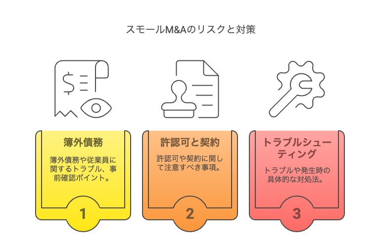 対策のポイントは、自分の能力と時間の限界を認識し、必要に応じて専門家の力を借りることです。特に初めてのM&Aでは、少額の顧問料を払ってでも専門家に相談することで、大きなリスクを回避できる可能性があります。