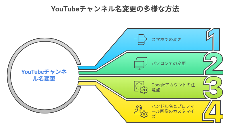 チャンネル名の変更方法は使用する端末によって異なります。ここでは、スマートフォン(iPhone・Android)、パソコン(PC・ブラウザ)それぞれの詳しい手順と、YouTube Studio利用時の注意点、プロフィール画像やハンドル名の同時変更方法まで解説します。