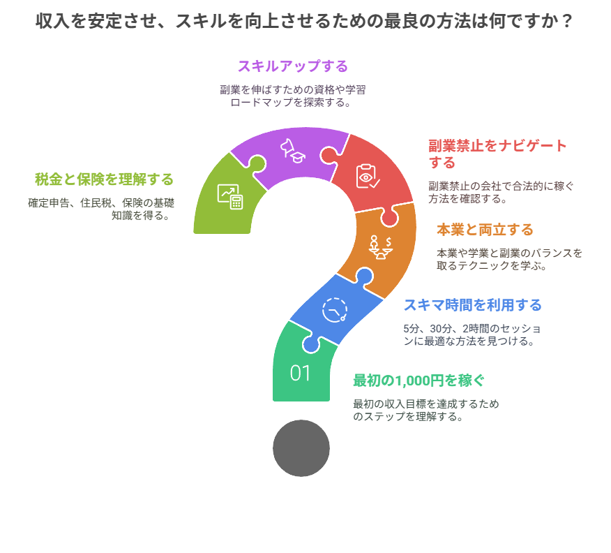 スマホひとつで始められるものから、スキルを活かして長期的に稼げるものまで、あなたの状況や目標に合わせて選べるよう詳しく解説しています。主婦の方なら家事の合間に、学生の方なら授業の空き時間に、会社員の方なら週末を活用して、無理なく収入アップを目指しましょう。