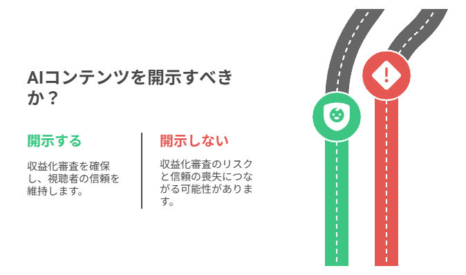2025年からYouTubeでは、AI生成コンテンツの開示が義務化されました。適切な開示を行わない場合、収益化停止や動画削除のリスクがあります。ここでは開示が必要なケースから具体的な手順、そして開示不足によるリスクまでを詳しく解説します。