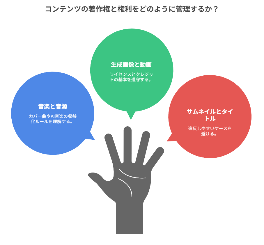 特に重要なのが「付加価値」の概念です。単にAIで画像を生成して音楽を付けただけでは不十分で、独自の解説、編集技術、企画性などが求められます。