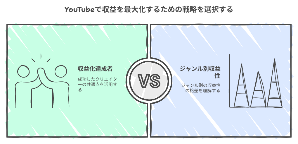 YouTubeではジャンルによって収益性に大きな差があります。高収益が期待できるジャンルと、競争が激しく収益化が困難なジャンルを比較してみましょう。