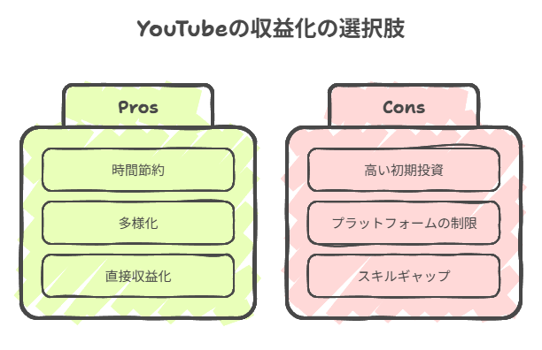 YouTube広告収益だけに依存せず、多角的な収益モデルを早期から構築することで、安定した事業基盤を作れます。
