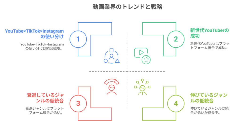 TikTokの台頭により動画業界の競争が激化したものの、YouTube市場自体は成長を続けており、問題は競争環境の変化への適応力です。成功しているクリエイターは、マルチプラットフォーム戦略、専門性の確立、コミュニティ形成に注力しています。