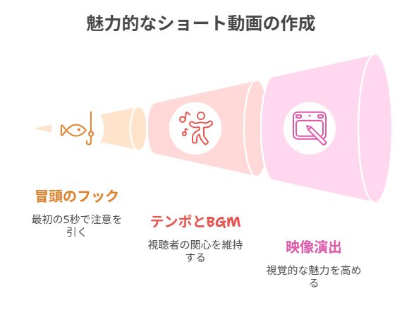通常の動画と比べて、ショートは瞬間的な魅力が重要。最初の数秒で視聴者の心を掴めるかどうかで、その後の拡散が決まります。